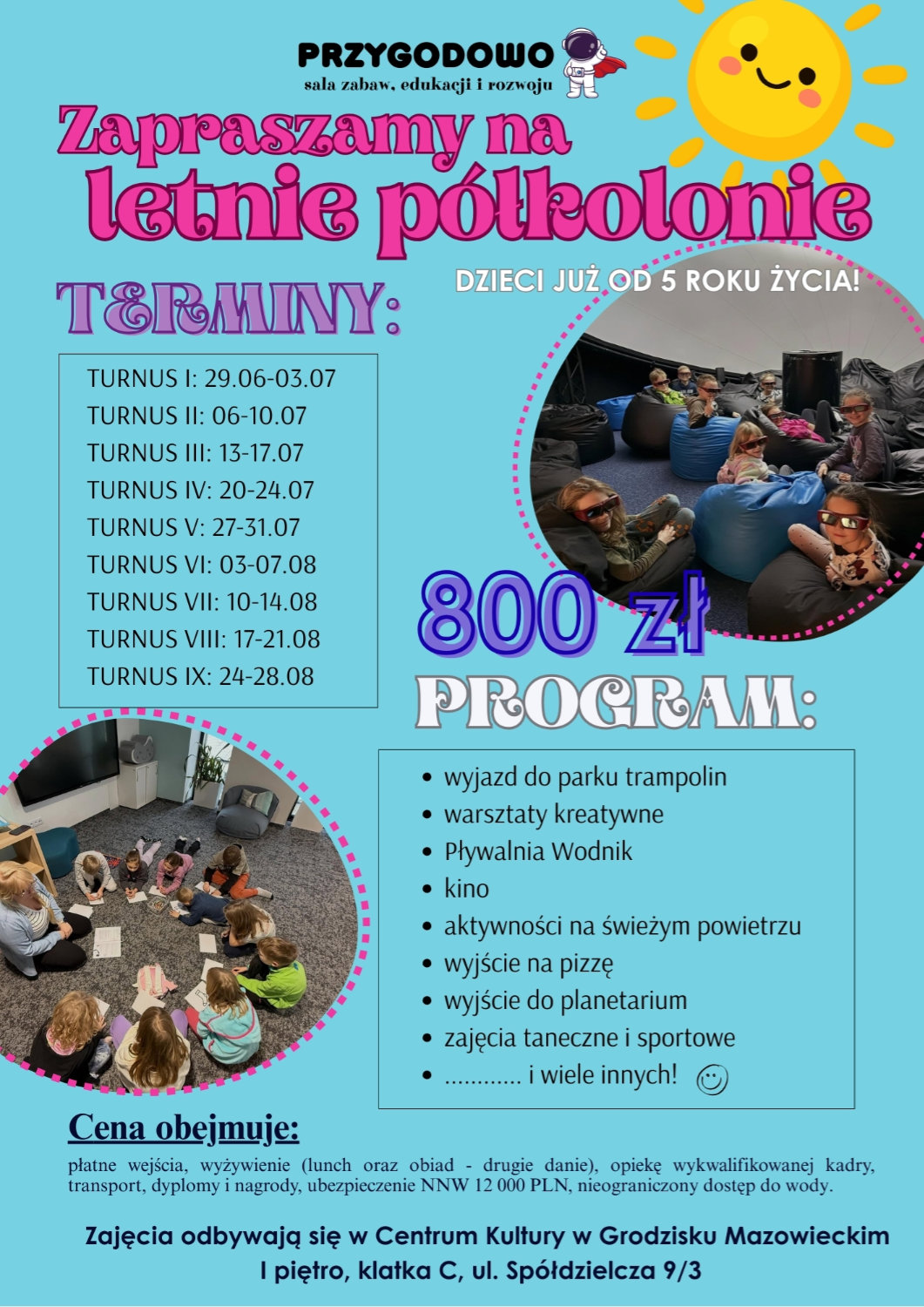 Decyduje kolejność zgłoszeń. Wszystkie zajęcia odbywają się w Przygodowo – sala zabaw, edukacji i rozwoju ul. Spółdzielcza 9/3 w Grodzisku Mazowieckim w budynku Centrum Kultury. W przypadku sytuacji nie zależnych od organizatora, jak pogoda program może ulec zmianie – kolejność atrakcji w danym dniu bądź tygodniu.